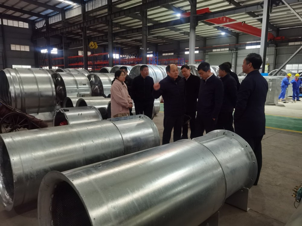 公司總裁劉書鵬(左二)向省經(jīng)信廳副廳長郭濤(左三)介紹地鐵風(fēng)機(jī)